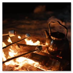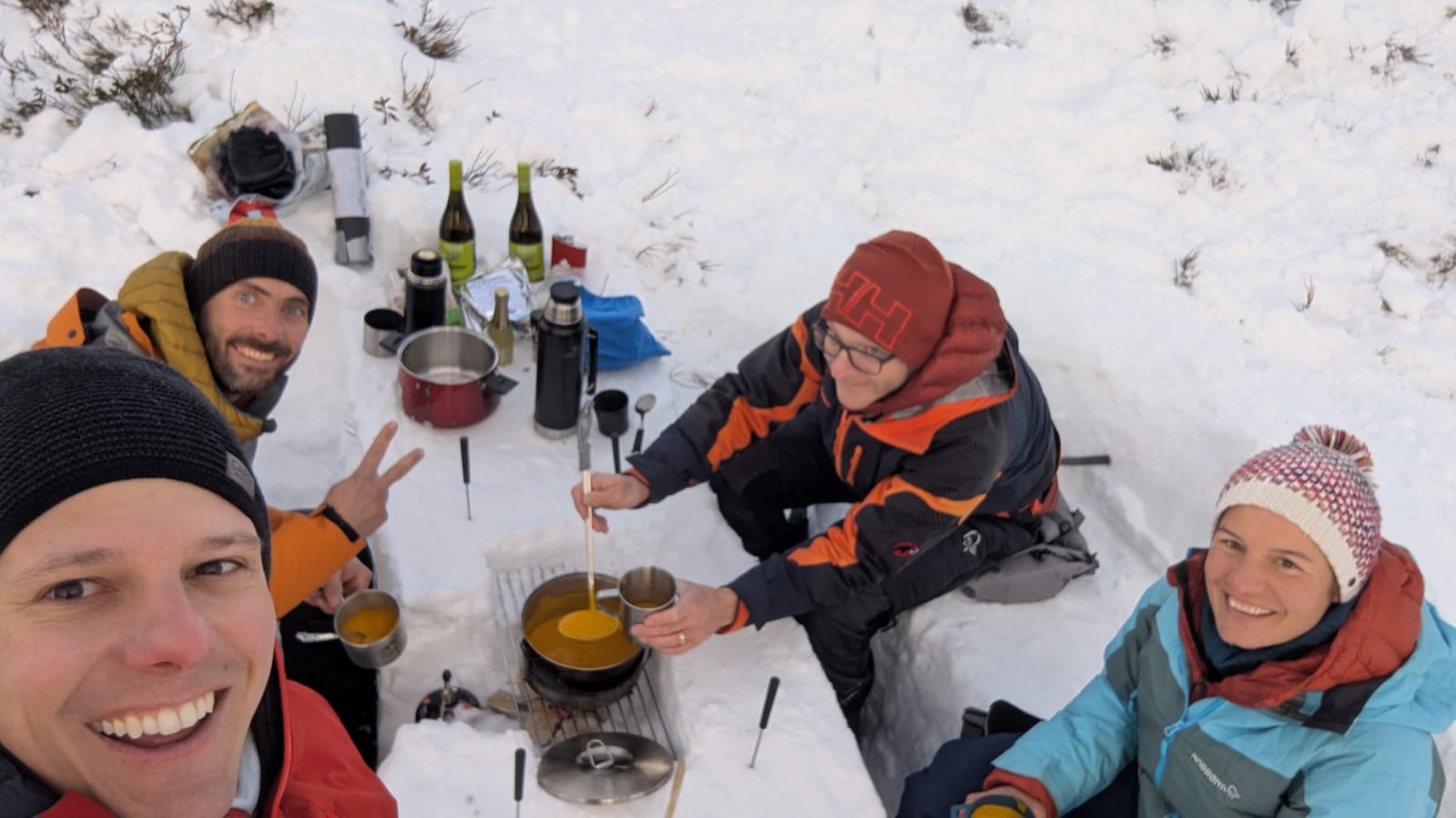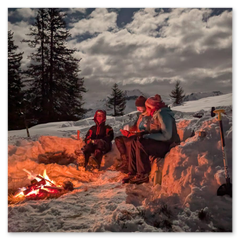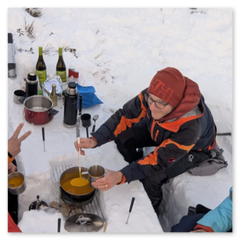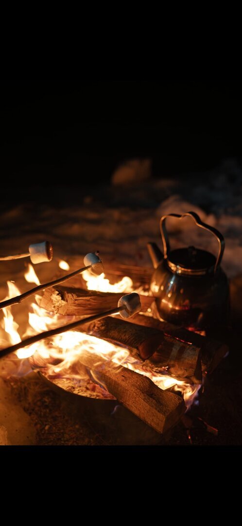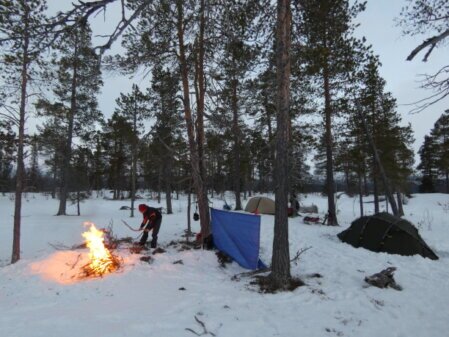 Auf unserer mini Expedition zieht jeder seine Ausrüstung auf der eigenen Pulka hinter sich her. An einem ruhigen Plätzchen über der Waldgrenze schlagen wir unser Lager auf. Am wärmenden Feuer werden wir uns verpflegen und die absolute Stille in der Natur geniessen. Die Nacht verbringen wir