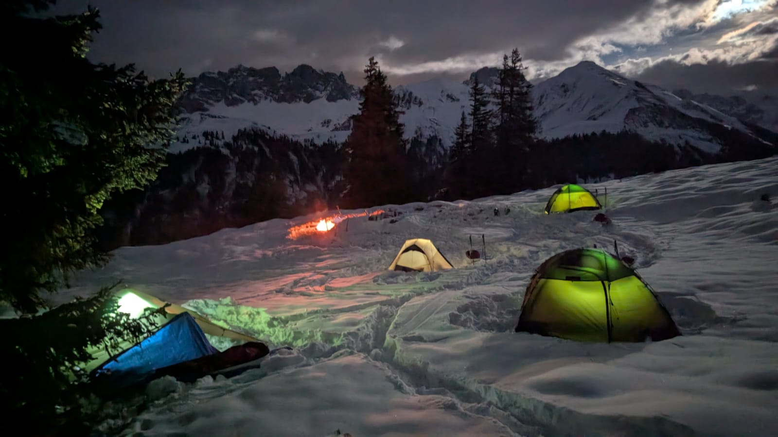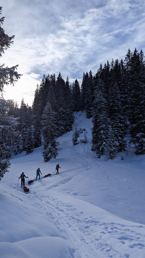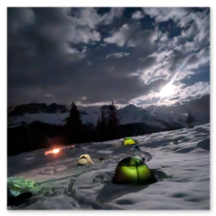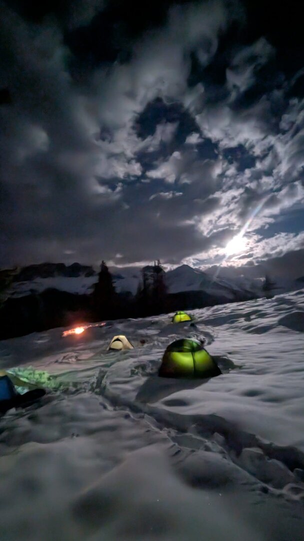 Mini «Expedition» in die Winterwunderwelt, hinter dem Mond links mit Pulka und Zeltübernachtung.