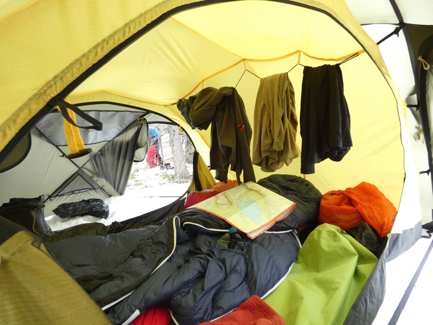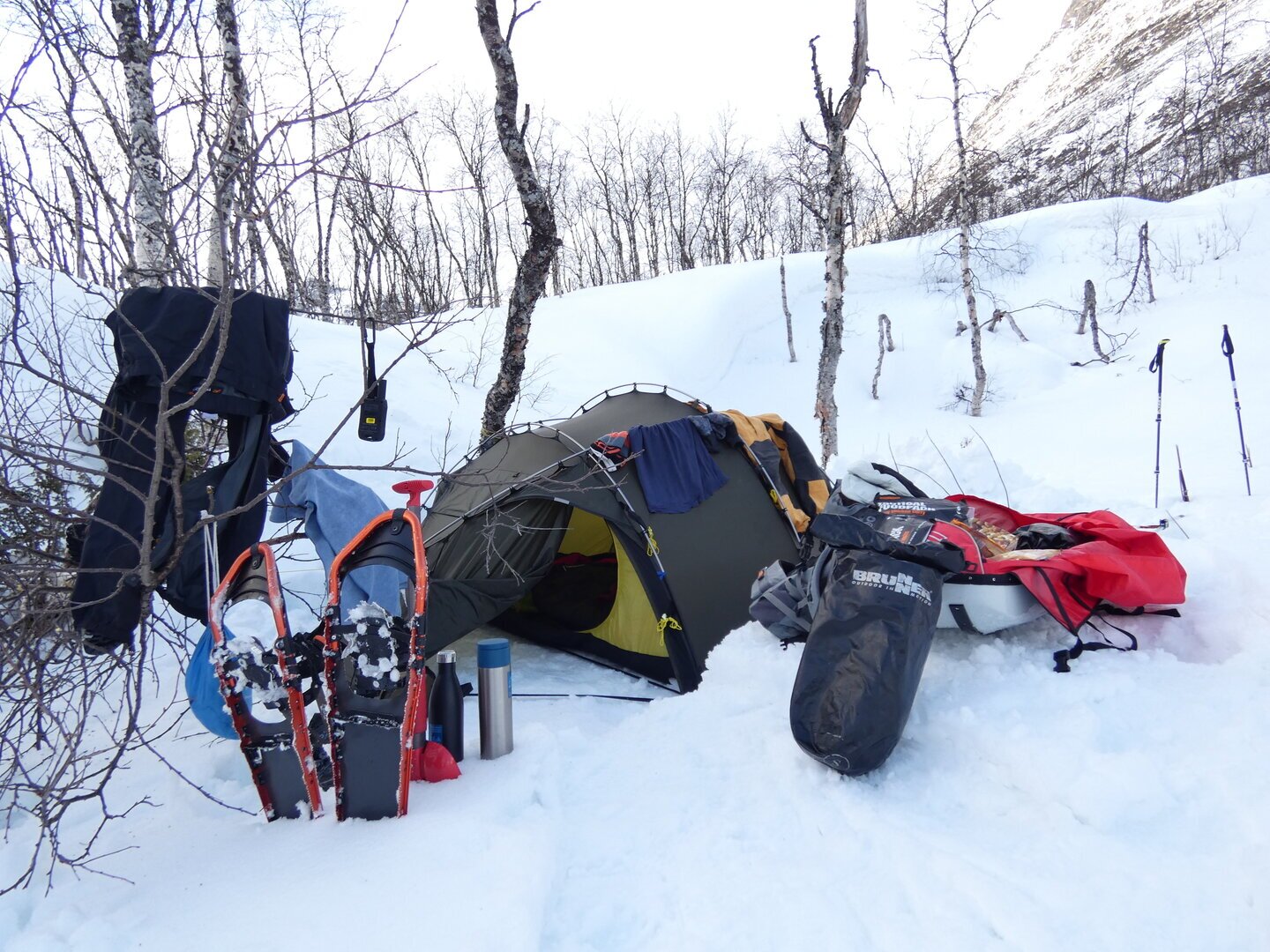 Im warmen Schlafsack im Zelt. Nach dem energiespendenden Frühstück machen wir uns auf eine Schneeschuhtour ganz ohne Gepäck. Zurück im Camp, wird alles auf die Pulkas gepackt und es geht zurück in die Zivilisation.